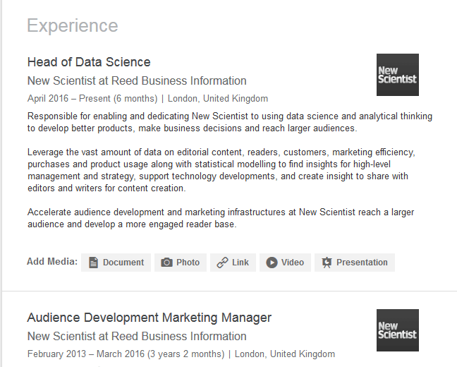 | How can I demonstrate that my actions are having a direct impact on business metrics in the long term? | Embed data driven decision making throughout New Scientist | Met with editorial and other commercial leadership team members to explain how my role could add value to their activity, efficiency and effectiveness. To date, marketing, digital team, news team, feature and event team reviews have been held. Advertising reviews have been scheduled in the diary for the sales team of both recruitment and display propositions in the UK and US.